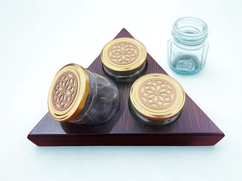 This unique gift box features a rotational triangle design and includes three salsa jars. Each jar is adorned with intricate acrylic laser-cut designs, adding a touch of elegance and sophistication to the presentation.